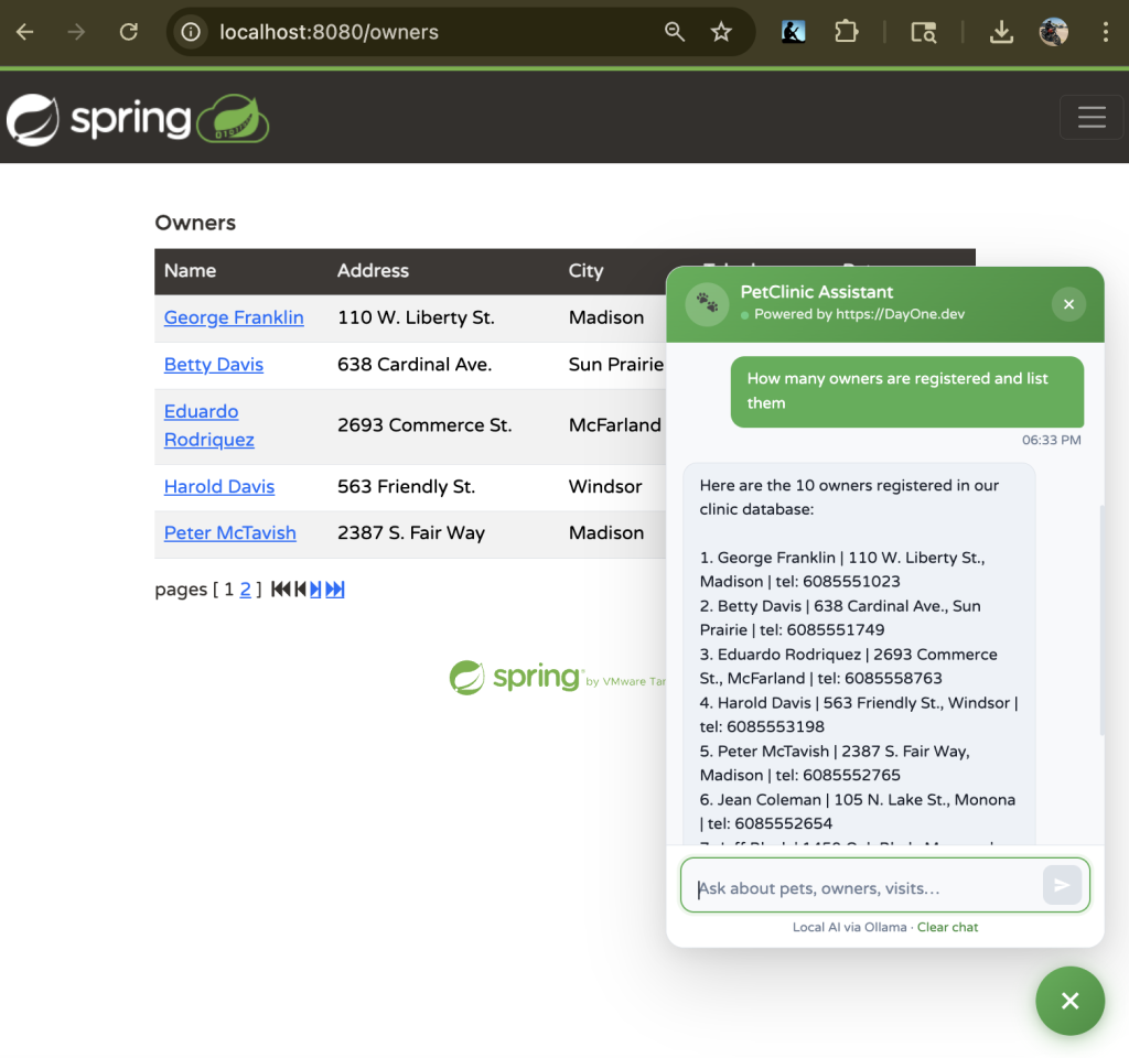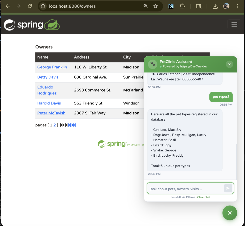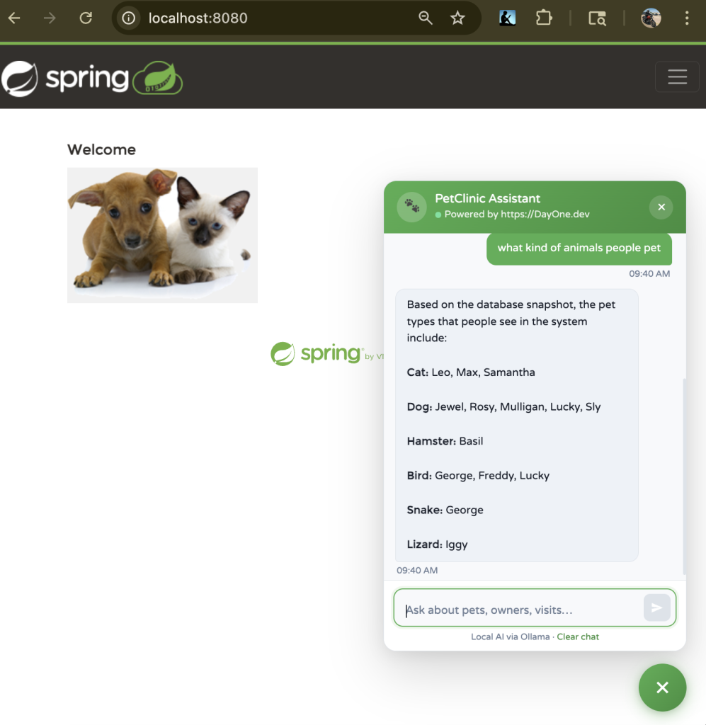 With AI Chat v1.0 tag, the application now features a context-aware chatbot capable of answering queries like List all pet owners or Add a new pet, while also executing real backend operations. Built with Spring Boot and Java 17+, it supports flexible AI providers, integrates a ChatClient for prompt-driven interactions, and extends the original architecture with a Spring AI layer, REST-based chat endpoint, and multiple database options. This project demonstrates how existing enterprise applications can evolve into AI-powered systems without major rewrites, offering a practical example for developers exploring AI integration in real-world scenarios.